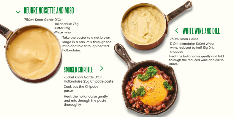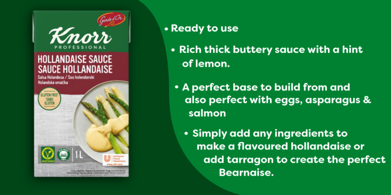 Knorr Garde D’or Hollandaise sauce is suitable for Vegatarians and Gluten free – making sure that more guests can enjoy your spring dishes without needing substitutions,